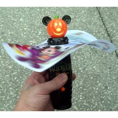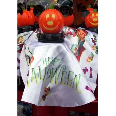 This is a Halloween Mickey Pumpkin light chaser toy. There are lights around the bottom of the pumpkin that “chase” each other around. There is a fabric cape around the toy with different Disney Characters in their Halloween costumes as well as a Happy Halloween message. It requires 2 AA Batteries which are included with the item.
