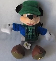 - Mickey Mouse is wearing a Green Cap and a Green plaid Scarf, blue sweater, and grey pants.