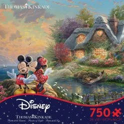 Relax and enjoy assembling this beautifully detailed 750-piece puzzle by Painter of Light, Thomas Kinkade. Minnie and Mickey share a kiss while visiting a warm and welcoming lakeside cottage as the sun sets on the horizon.
