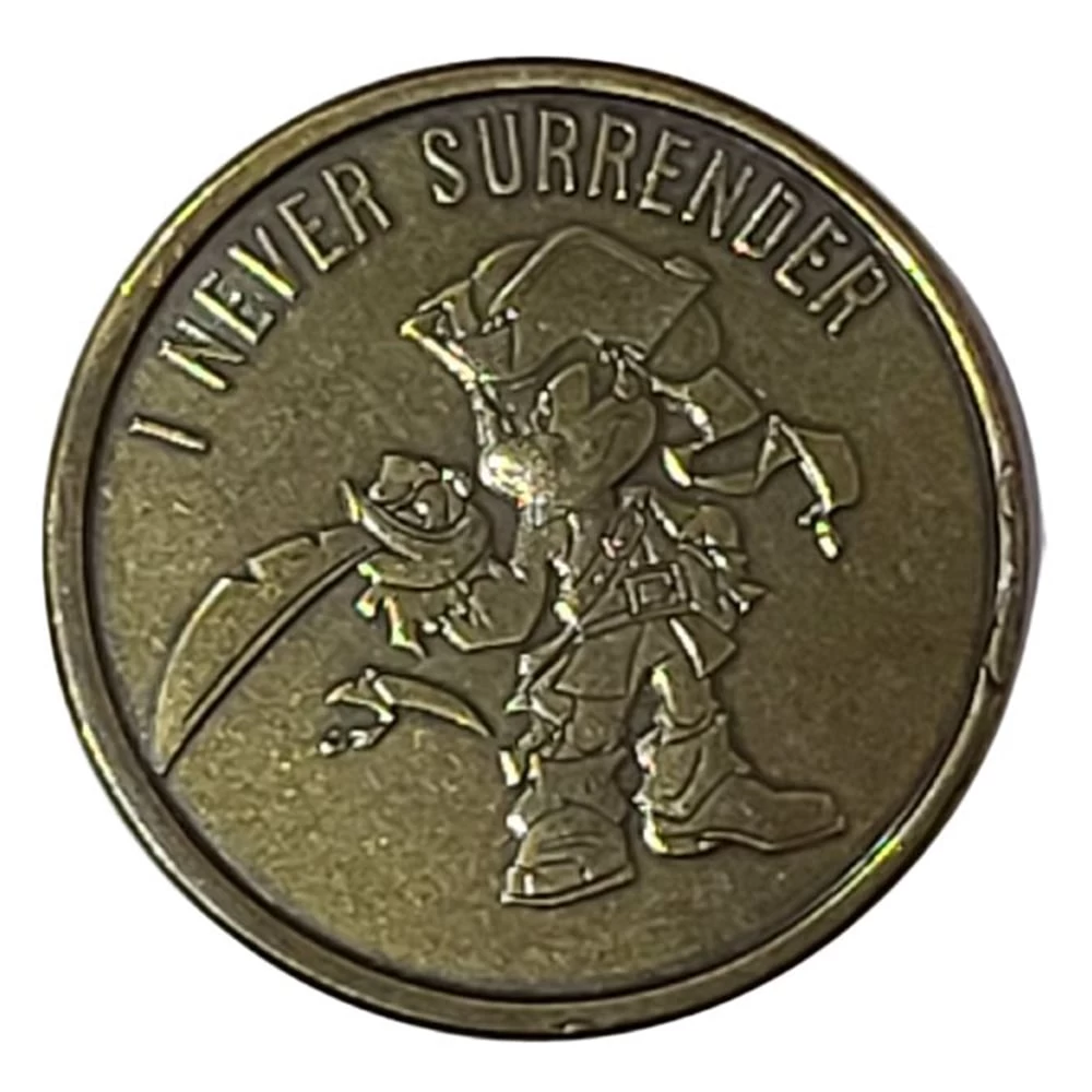 - Says ”Disney Pirates of the Caribbean” on one side and ‘I NEVER SURRENDER” with the character on the other